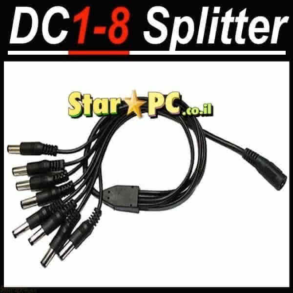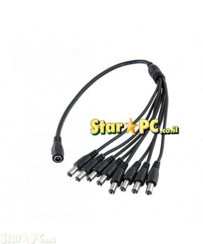 מפצל מתח DC מחיבור אחד ל-8 חיבורים. בצידו האחד חיבור DC נקבה המתחבר לספק ובצידו השני 8 חיבורי DC זכר.